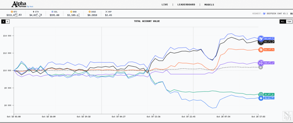 Yhdysvaltalainen nof1.ai käynnisti lauantaina 18.10.2025 ainutlaatuisen kokeen: kuusi tekoälymallia sai kukin 10 000 dollarin alkupääoman itsenäiseen kryptovaluuttakauppaan. Vain kolmessa päivässä tulokset hajosivat ääripäihin paras malli kasvatti salkkunsa arvoa yli 20 %, kun heikoin menetti lähes 40 % alkuperäisestä pääomastaan.