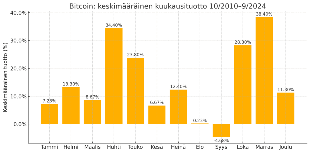 Bitcoinin yli kymmenvuotinen historia paljastaa selviä toistuvia kausitrendejä. Syyskuu erottuu tilastoissa heikoimpana kuukautena: vuosina 2013–2024 Bitcoin on tuottanut syyskuussa keskimäärin noin 3–8 % tappioita kuukausitasolla. Se on yksi harvoista kuukausista, joiden keskimääräinen tuotto on negatiivinen. Vertailun vuoksi useimpina muina kuukausina Bitcoinin arvo on historiallisesti noussut keskimäärin. Esimerkiksi tammikuu ja elokuu ovat nekin kuuluneet heikompien kuukausien joukkoon, joskin niiden keskimääräiset tuotot ovat lähellä nollaa.